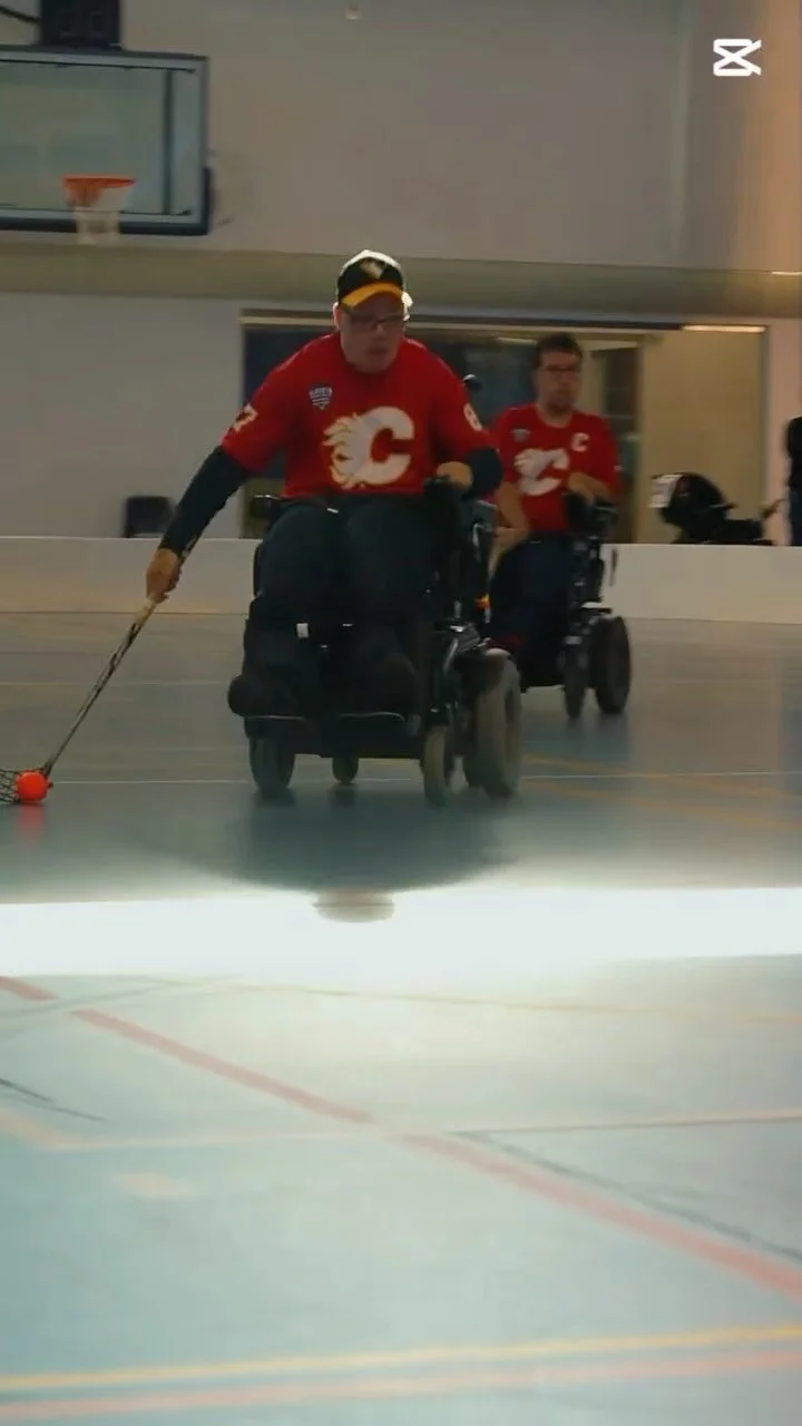 Powerchair Hockey is a fast, skill-based team sport designed for individuals who use power wheelchairs. Players compete using lightweight plastic sticks to pass, shoot, and score with a wiffle ball, following modified floor hockey rules that ensure safety, inclusion, and excitement for athletes of all ability levels. Players may either hold their stick or have it securely attached to their chair, depending on their mobility and preference.
